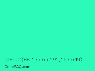 CIELCh 88.135,65.191,163.649 Color is a normal green color and the nearest color is Turquoise PWG #30d5c8. Hex code #2bfab8 and RGB value is rgb(43,250,184). In RGB color space, this color is composed of 17% red, 98% green, 72% blue, In CMYK color space, this color is composed of 83% cyan, 0% magenta, 26% yellow , 2% black , In HSL color space, this color has a hue angle of 161° , 95% saturation and 57% lightness.