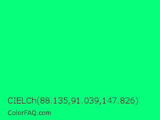 CIELCh 88.135,91.039,147.826 Color is a normal green color and the nearest color is Spring Green #00ff7f. Hex code #05fe7b and RGB value is rgb(5,254,123). In RGB color space, this color is composed of 2% red, 100% green, 48% blue, In CMYK color space, this color is composed of 98% cyan, 0% magenta, 52% yellow , 0% black , In HSL color space, this color has a hue angle of 148° , 99% saturation and 51% lightness.