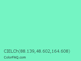 CIELCh 88.139,48.602,164.608 Color is a light green color and the nearest color is Aquamarine #7fffd4. Hex code #74f4c3 and RGB value is rgb(116,244,195). In RGB color space, this color is composed of 45% red, 96% green, 76% blue, In CMYK color space, this color is composed of 52% cyan, 0% magenta, 20% yellow , 4% black , In HSL color space, this color has a hue angle of 157° , 85% saturation and 71% lightness.