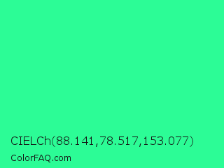 CIELCh 88.141,78.517,153.077 Color is a normal green color and the nearest color is Medium Spring Green #00fa9a. Hex code #2cfc96 and RGB value is rgb(44,252,150). In RGB color space, this color is composed of 17% red, 99% green, 59% blue, In CMYK color space, this color is composed of 83% cyan, 0% magenta, 40% yellow , 1% black , In HSL color space, this color has a hue angle of 151° , 97% saturation and 58% lightness.