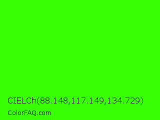 CIELCh 88.148,117.149,134.729 Color is a normal green color and the nearest color is Harlequin #3fff00. Hex code #38ff06 and RGB value is rgb(56,255,6). In RGB color space, this color is composed of 22% red, 100% green, 2% blue, In CMYK color space, this color is composed of 78% cyan, 0% magenta, 98% yellow , 0% black , In HSL color space, this color has a hue angle of 108° , 100% saturation and 51% lightness.