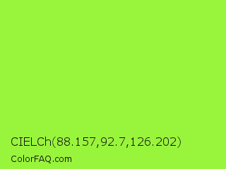 CIELCh 88.157,92.7,126.202 Color is a normal green color and the nearest color is French Lime #9efd38. Hex code #99f53b and RGB value is rgb(153,245,59). In RGB color space, this color is composed of 60% red, 96% green, 23% blue, In CMYK color space, this color is composed of 38% cyan, 0% magenta, 76% yellow , 4% black , In HSL color space, this color has a hue angle of 90° , 90% saturation and 60% lightness.