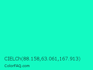 CIELCh 88.158,63.061,167.913 Color is a normal cyan color and the nearest color is Bright Turquoise #08e8de. Hex code #12fac2 and RGB value is rgb(18,250,194). In RGB color space, this color is composed of 7% red, 98% green, 76% blue, In CMYK color space, this color is composed of 93% cyan, 0% magenta, 22% yellow , 2% black , In HSL color space, this color has a hue angle of 166° , 96% saturation and 53% lightness.