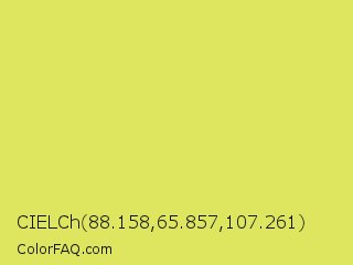 CIELCh 88.158,65.857,107.261 Color is a light yellow color and the nearest color is Booger Buster #dde26a. Hex code #dee55f and RGB value is rgb(222,229,95). In RGB color space, this color is composed of 87% red, 90% green, 37% blue, In CMYK color space, this color is composed of 3% cyan, 0% magenta, 59% yellow , 10% black , In HSL color space, this color has a hue angle of 63° , 72% saturation and 64% lightness.