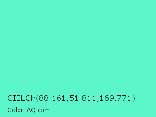 CIELCh 88.161,51.811,169.771 Color is a light green color and the nearest color is Turquoise #40e0d0. Hex code #5bf6ca and RGB value is rgb(91,246,202). In RGB color space, this color is composed of 36% red, 96% green, 79% blue, In CMYK color space, this color is composed of 63% cyan, 0% magenta, 18% yellow , 4% black , In HSL color space, this color has a hue angle of 163° , 90% saturation and 66% lightness.