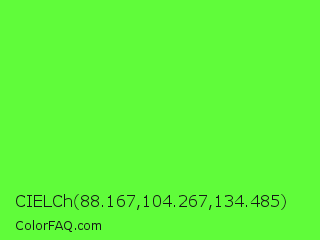 CIELCh 88.167,104.267,134.485 Color is a light green color and the nearest color is Spring Frost #87ff2a. Hex code #60fc3a and RGB value is rgb(96,252,58). In RGB color space, this color is composed of 38% red, 99% green, 23% blue, In CMYK color space, this color is composed of 62% cyan, 0% magenta, 77% yellow , 1% black , In HSL color space, this color has a hue angle of 108° , 97% saturation and 61% lightness.