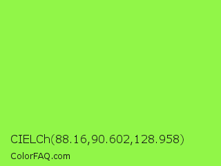 CIELCh 88.16,90.602,128.958 Color is a light green color and the nearest color is Kiwi #8ee53f. Hex code #91f648 and RGB value is rgb(145,246,72). In RGB color space, this color is composed of 57% red, 96% green, 28% blue, In CMYK color space, this color is composed of 41% cyan, 0% magenta, 71% yellow , 4% black , In HSL color space, this color has a hue angle of 95° , 91% saturation and 62% lightness.