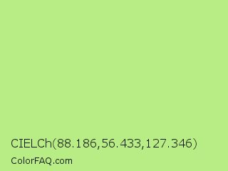 CIELCh 88.186,56.433,127.346 Color is a light green color and the nearest color is Sulu #c1f07c. Hex code #b8ed85 and RGB value is rgb(184,237,133). In RGB color space, this color is composed of 72% red, 93% green, 52% blue, In CMYK color space, this color is composed of 22% cyan, 0% magenta, 44% yellow , 7% black , In HSL color space, this color has a hue angle of 91° , 74% saturation and 73% lightness.