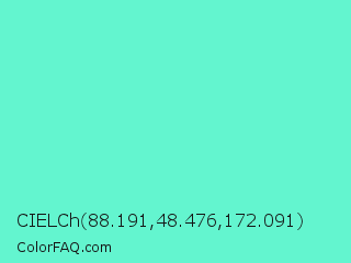 CIELCh 88.191,48.476,172.091 Color is a light cyan color and the nearest color is Aquamarine #7fffd4. Hex code #63f5cf and RGB value is rgb(99,245,207). In RGB color space, this color is composed of 39% red, 96% green, 81% blue, In CMYK color space, this color is composed of 60% cyan, 0% magenta, 16% yellow , 4% black , In HSL color space, this color has a hue angle of 164° , 88% saturation and 67% lightness.