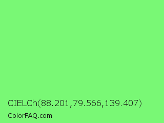 CIELCh 88.201,79.566,139.407 Color is a light green color and the nearest color is Screamin Green #66ff66. Hex code #79f875 and RGB value is rgb(121,248,117). In RGB color space, this color is composed of 47% red, 97% green, 46% blue, In CMYK color space, this color is composed of 51% cyan, 0% magenta, 53% yellow , 3% black , In HSL color space, this color has a hue angle of 118° , 90% saturation and 72% lightness.