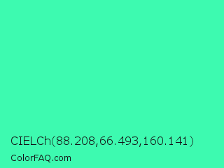 CIELCh 88.208,66.493,160.141 Color is a light green color and the nearest color is Eucalyptus #44d7a8. Hex code #3dfab0 and RGB value is rgb(61,250,176). In RGB color space, this color is composed of 24% red, 98% green, 69% blue, In CMYK color space, this color is composed of 76% cyan, 0% magenta, 30% yellow , 2% black , In HSL color space, this color has a hue angle of 157° , 95% saturation and 61% lightness.