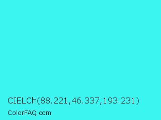 CIELCh 88.221,46.337,193.231 Color is a normal cyan color and the nearest color is Turquoise #40e0d0. Hex code #3bf5f0 and RGB value is rgb(59,245,240). In RGB color space, this color is composed of 23% red, 96% green, 94% blue, In CMYK color space, this color is composed of 76% cyan, 0% magenta, 2% yellow , 4% black , In HSL color space, this color has a hue angle of 178° , 90% saturation and 60% lightness.