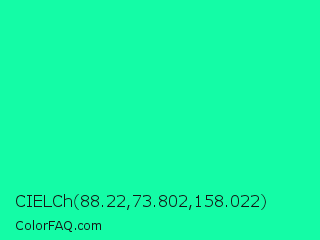 CIELCh 88.22,73.802,158.022 Color is a normal green color and the nearest color is Medium Spring Green #00fa9a. Hex code #14fca6 and RGB value is rgb(20,252,166). In RGB color space, this color is composed of 8% red, 99% green, 65% blue, In CMYK color space, this color is composed of 92% cyan, 0% magenta, 34% yellow , 1% black , In HSL color space, this color has a hue angle of 158° , 97% saturation and 53% lightness.