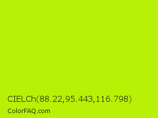 CIELCh 88.22,95.443,116.798 Color is a normal lime color and the nearest color is Lime #bfff00. Hex code #b8f006 and RGB value is rgb(184,240,6). In RGB color space, this color is composed of 72% red, 94% green, 2% blue, In CMYK color space, this color is composed of 23% cyan, 0% magenta, 98% yellow , 6% black , In HSL color space, this color has a hue angle of 74° , 95% saturation and 48% lightness.