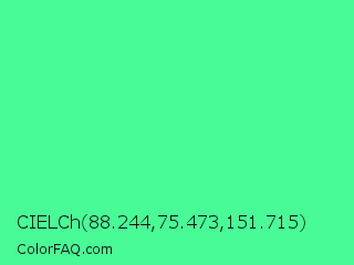 CIELCh 88.244,75.473,151.715 Color is a light green color and the nearest color is Very Light Malachite Green #64e986. Hex code #48fb96 and RGB value is rgb(72,251,150). In RGB color space, this color is composed of 28% red, 98% green, 59% blue, In CMYK color space, this color is composed of 71% cyan, 0% magenta, 40% yellow , 2% black , In HSL color space, this color has a hue angle of 146° , 96% saturation and 63% lightness.