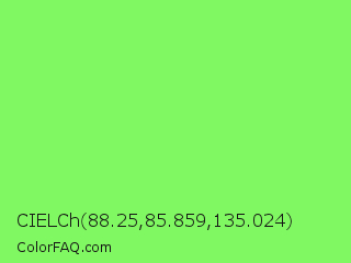 CIELCh 88.25,85.859,135.024 Color is a light green color and the nearest color is Screamin Green #66ff66. Hex code #80f861 and RGB value is rgb(128,248,97). In RGB color space, this color is composed of 50% red, 97% green, 38% blue, In CMYK color space, this color is composed of 48% cyan, 0% magenta, 61% yellow , 3% black , In HSL color space, this color has a hue angle of 108° , 92% saturation and 68% lightness.