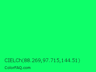 CIELCh 88.269,97.715,144.51 Color is a normal green color and the nearest color is Spring Green #00ff7f. Hex code #0dff69 and RGB value is rgb(13,255,105). In RGB color space, this color is composed of 5% red, 100% green, 41% blue, In CMYK color space, this color is composed of 95% cyan, 0% magenta, 59% yellow , 0% black , In HSL color space, this color has a hue angle of 143° , 100% saturation and 53% lightness.