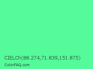 CIELCh 88.274,71.839,151.875 Color is a light green color and the nearest color is Very Light Malachite Green #64e986. Hex code #55fa9a and RGB value is rgb(85,250,154). In RGB color space, this color is composed of 33% red, 98% green, 60% blue, In CMYK color space, this color is composed of 66% cyan, 0% magenta, 38% yellow , 2% black , In HSL color space, this color has a hue angle of 145° , 94% saturation and 66% lightness.