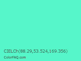 CIELCh 88.29,53.524,169.356 Color is a light green color and the nearest color is Turquoise #40e0d0. Hex code #55f7c9 and RGB value is rgb(85,247,201). In RGB color space, this color is composed of 33% red, 97% green, 79% blue, In CMYK color space, this color is composed of 66% cyan, 0% magenta, 19% yellow , 3% black , In HSL color space, this color has a hue angle of 163° , 91% saturation and 65% lightness.