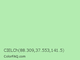 CIELCh 88.309,37.553,141.5 Color is a very light green color and the nearest color is Celadon #ace1af. Hex code #b3ecb0 and RGB value is rgb(179,236,176). In RGB color space, this color is composed of 70% red, 93% green, 69% blue, In CMYK color space, this color is composed of 24% cyan, 0% magenta, 25% yellow , 7% black , In HSL color space, this color has a hue angle of 117° , 61% saturation and 81% lightness.