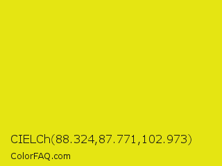 CIELCh 88.324,87.771,102.973 Color is a normal yellow color and the nearest color is Piss Yellow #e1e115. Hex code #e5e512 and RGB value is rgb(229,229,18). In RGB color space, this color is composed of 90% red, 90% green, 7% blue, In CMYK color space, this color is composed of 0% cyan, 0% magenta, 92% yellow , 10% black , In HSL color space, this color has a hue angle of 60° , 85% saturation and 48% lightness.
