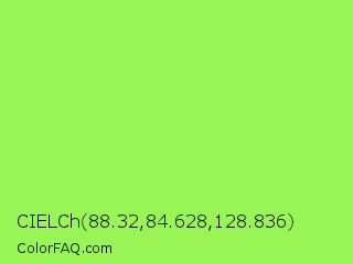 CIELCh 88.32,84.628,128.836 Color is a light green color and the nearest color is Inchworm #b2ec5d. Hex code #99f555 and RGB value is rgb(153,245,85). In RGB color space, this color is composed of 60% red, 96% green, 33% blue, In CMYK color space, this color is composed of 38% cyan, 0% magenta, 65% yellow , 4% black , In HSL color space, this color has a hue angle of 95° , 89% saturation and 65% lightness.
