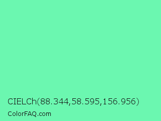 CIELCh 88.344,58.595,156.956 Color is a light green color and the nearest color is Medium Aquamarine #66ddaa. Hex code #6bf7b0 and RGB value is rgb(107,247,176). In RGB color space, this color is composed of 42% red, 97% green, 69% blue, In CMYK color space, this color is composed of 57% cyan, 0% magenta, 29% yellow , 3% black , In HSL color space, this color has a hue angle of 150° , 90% saturation and 69% lightness.