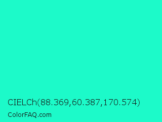 CIELCh 88.369,60.387,170.574 Color is a normal cyan color and the nearest color is Bright Turquoise #08e8de. Hex code #1cfac9 and RGB value is rgb(28,250,201). In RGB color space, this color is composed of 11% red, 98% green, 79% blue, In CMYK color space, this color is composed of 89% cyan, 0% magenta, 20% yellow , 2% black , In HSL color space, this color has a hue angle of 167° , 96% saturation and 55% lightness.
