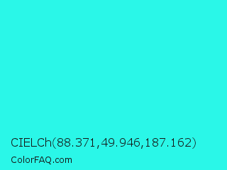 CIELCh 88.371,49.946,187.162 Color is a normal cyan color and the nearest color is Loeen #15f2fd. Hex code #2af7e8 and RGB value is rgb(42,247,232). In RGB color space, this color is composed of 16% red, 97% green, 91% blue, In CMYK color space, this color is composed of 83% cyan, 0% magenta, 6% yellow , 3% black , In HSL color space, this color has a hue angle of 176° , 93% saturation and 57% lightness.