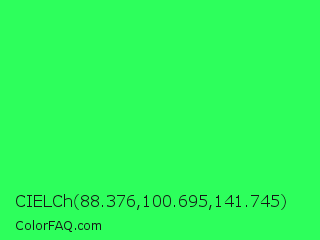 CIELCh 88.376,100.695,141.745 Color is a normal green color and the nearest color is Malachite #0bda51. Hex code #2dff5c and RGB value is rgb(45,255,92). In RGB color space, this color is composed of 18% red, 100% green, 36% blue, In CMYK color space, this color is composed of 82% cyan, 0% magenta, 64% yellow , 0% black , In HSL color space, this color has a hue angle of 133° , 100% saturation and 59% lightness.