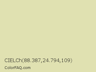 CIELCh 88.387,24.794,109 Color is a light yellow color and the nearest color is Hampton #e5d8af. Hex code #e0e1b1 and RGB value is rgb(224,225,177). In RGB color space, this color is composed of 88% red, 88% green, 69% blue, In CMYK color space, this color is composed of 0% cyan, 0% magenta, 21% yellow , 12% black , In HSL color space, this color has a hue angle of 61° , 44% saturation and 79% lightness.