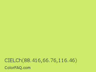 CIELCh 88.416,66.76,116.46 Color is a light lime color and the nearest color is Booger Buster #dde26a. Hex code #caeb66 and RGB value is rgb(202,235,102). In RGB color space, this color is composed of 79% red, 92% green, 40% blue, In CMYK color space, this color is composed of 14% cyan, 0% magenta, 57% yellow , 8% black , In HSL color space, this color has a hue angle of 75° , 77% saturation and 66% lightness.