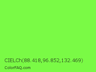 CIELCh 88.418,96.852,132.469 Color is a light green color and the nearest color is Kiwi #8ee53f. Hex code #7afa45 and RGB value is rgb(122,250,69). In RGB color space, this color is composed of 48% red, 98% green, 27% blue, In CMYK color space, this color is composed of 51% cyan, 0% magenta, 72% yellow , 2% black , In HSL color space, this color has a hue angle of 102° , 95% saturation and 63% lightness.