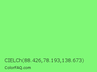 CIELCh 88.426,78.193,138.673 Color is a light green color and the nearest color is Pastel Green #77dd77. Hex code #7ff876 and RGB value is rgb(127,248,118). In RGB color space, this color is composed of 50% red, 97% green, 46% blue, In CMYK color space, this color is composed of 49% cyan, 0% magenta, 52% yellow , 3% black , In HSL color space, this color has a hue angle of 116° , 90% saturation and 72% lightness.