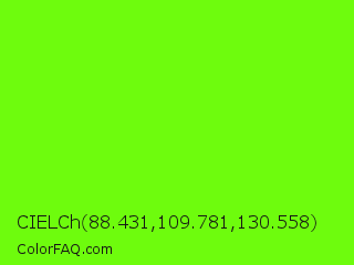 CIELCh 88.431,109.781,130.558 Color is a normal green color and the nearest color is Bright Green #66ff00. Hex code #6efc0d and RGB value is rgb(110,252,13). In RGB color space, this color is composed of 43% red, 99% green, 5% blue, In CMYK color space, this color is composed of 56% cyan, 0% magenta, 95% yellow , 1% black , In HSL color space, this color has a hue angle of 96° , 98% saturation and 52% lightness.