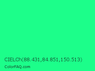 CIELCh 88.431,84.851,150.513 Color is a normal green color and the nearest color is Spring Green #00ff7f. Hex code #1cfe8a and RGB value is rgb(28,254,138). In RGB color space, this color is composed of 11% red, 100% green, 54% blue, In CMYK color space, this color is composed of 89% cyan, 0% magenta, 46% yellow , 0% black , In HSL color space, this color has a hue angle of 149° , 99% saturation and 55% lightness.