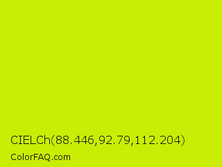 CIELCh 88.446,92.79,112.204 Color is a normal yellow color and the nearest color is Las Palmas #c6e610. Hex code #c9ed05 and RGB value is rgb(201,237,5). In RGB color space, this color is composed of 79% red, 93% green, 2% blue, In CMYK color space, this color is composed of 15% cyan, 0% magenta, 98% yellow , 7% black , In HSL color space, this color has a hue angle of 69° , 96% saturation and 47% lightness.