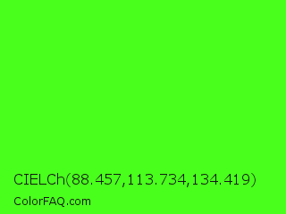 CIELCh 88.457,113.734,134.419 Color is a normal green color and the nearest color is Neon Green #39ff14. Hex code #49ff1c and RGB value is rgb(73,255,28). In RGB color space, this color is composed of 29% red, 100% green, 11% blue, In CMYK color space, this color is composed of 71% cyan, 0% magenta, 89% yellow , 0% black , In HSL color space, this color has a hue angle of 108° , 100% saturation and 55% lightness.