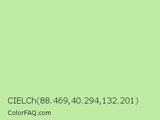 CIELCh 88.469,40.294,132.201 Color is a light green color and the nearest color is Moss Green #addfad. Hex code #beeba4 and RGB value is rgb(190,235,164). In RGB color space, this color is composed of 75% red, 92% green, 64% blue, In CMYK color space, this color is composed of 19% cyan, 0% magenta, 30% yellow , 8% black , In HSL color space, this color has a hue angle of 98° , 64% saturation and 78% lightness.