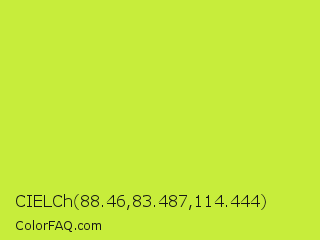 CIELCh 88.46,83.487,114.444 Color is a normal lime color and the nearest color is Pear #d1e231. Hex code #c7ed3b and RGB value is rgb(199,237,59). In RGB color space, this color is composed of 78% red, 93% green, 23% blue, In CMYK color space, this color is composed of 16% cyan, 0% magenta, 75% yellow , 7% black , In HSL color space, this color has a hue angle of 73° , 83% saturation and 58% lightness.
