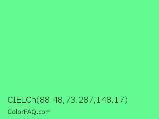CIELCh 88.48,73.287,148.17 Color is a light green color and the nearest color is Very Light Malachite Green #64e986. Hex code #63fa91 and RGB value is rgb(99,250,145). In RGB color space, this color is composed of 39% red, 98% green, 57% blue, In CMYK color space, this color is composed of 60% cyan, 0% magenta, 42% yellow , 2% black , In HSL color space, this color has a hue angle of 138° , 94% saturation and 68% lightness.
