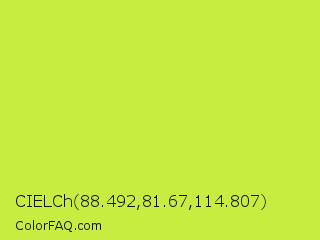 CIELCh 88.492,81.67,114.807 Color is a normal lime color and the nearest color is Pear #d1e231. Hex code #c7ed41 and RGB value is rgb(199,237,65). In RGB color space, this color is composed of 78% red, 93% green, 25% blue, In CMYK color space, this color is composed of 16% cyan, 0% magenta, 73% yellow , 7% black , In HSL color space, this color has a hue angle of 73° , 83% saturation and 59% lightness.