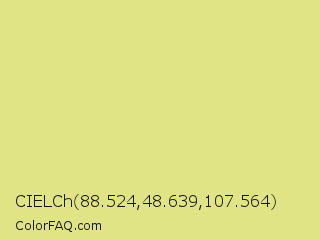 CIELCh 88.524,48.639,107.564 Color is a light yellow color and the nearest color is Flax #eedc82. Hex code #e1e484 and RGB value is rgb(225,228,132). In RGB color space, this color is composed of 88% red, 89% green, 52% blue, In CMYK color space, this color is composed of 1% cyan, 0% magenta, 42% yellow , 11% black , In HSL color space, this color has a hue angle of 62° , 64% saturation and 71% lightness.