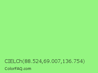 CIELCh 88.524,69.007,136.754 Color is a light green color and the nearest color is Light Green #90ee90. Hex code #94f580 and RGB value is rgb(148,245,128). In RGB color space, this color is composed of 58% red, 96% green, 50% blue, In CMYK color space, this color is composed of 40% cyan, 0% magenta, 48% yellow , 4% black , In HSL color space, this color has a hue angle of 110° , 85% saturation and 73% lightness.