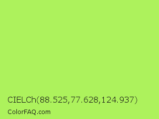 CIELCh 88.525,77.628,124.937 Color is a light green color and the nearest color is Inchworm #b2ec5d. Hex code #adf25c and RGB value is rgb(173,242,92). In RGB color space, this color is composed of 68% red, 95% green, 36% blue, In CMYK color space, this color is composed of 29% cyan, 0% magenta, 62% yellow , 5% black , In HSL color space, this color has a hue angle of 88° , 85% saturation and 65% lightness.