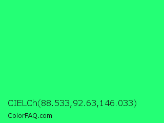 CIELCh 88.533,92.63,146.033 Color is a normal green color and the nearest color is Spring Green #00ff7f. Hex code #24ff75 and RGB value is rgb(36,255,117). In RGB color space, this color is composed of 14% red, 100% green, 46% blue, In CMYK color space, this color is composed of 86% cyan, 0% magenta, 54% yellow , 0% black , In HSL color space, this color has a hue angle of 142° , 100% saturation and 57% lightness.