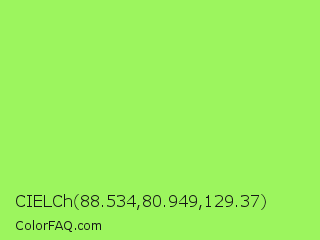 CIELCh 88.534,80.949,129.37 Color is a light green color and the nearest color is Inchworm #b2ec5d. Hex code #9cf55e and RGB value is rgb(156,245,94). In RGB color space, this color is composed of 61% red, 96% green, 37% blue, In CMYK color space, this color is composed of 36% cyan, 0% magenta, 62% yellow , 4% black , In HSL color space, this color has a hue angle of 95° , 88% saturation and 66% lightness.