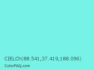 CIELCh 88.541,37.419,188.096 Color is a light cyan color and the nearest color is Spray #79deec. Hex code #77f2e7 and RGB value is rgb(119,242,231). In RGB color space, this color is composed of 47% red, 95% green, 91% blue, In CMYK color space, this color is composed of 51% cyan, 0% magenta, 5% yellow , 5% black , In HSL color space, this color has a hue angle of 175° , 83% saturation and 71% lightness.