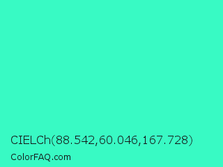 CIELCh 88.542,60.046,167.728 Color is a normal green color and the nearest color is Turquoise #40e0d0. Hex code #38fac4 and RGB value is rgb(56,250,196). In RGB color space, this color is composed of 22% red, 98% green, 77% blue, In CMYK color space, this color is composed of 78% cyan, 0% magenta, 22% yellow , 2% black , In HSL color space, this color has a hue angle of 163° , 95% saturation and 60% lightness.