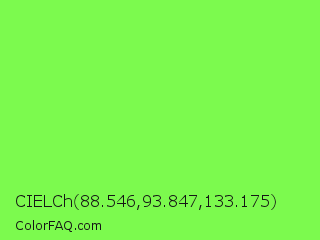CIELCh 88.546,93.847,133.175 Color is a light green color and the nearest color is Kiwi #8ee53f. Hex code #7cfa4e and RGB value is rgb(124,250,78). In RGB color space, this color is composed of 49% red, 98% green, 31% blue, In CMYK color space, this color is composed of 50% cyan, 0% magenta, 69% yellow , 2% black , In HSL color space, this color has a hue angle of 104° , 95% saturation and 64% lightness.